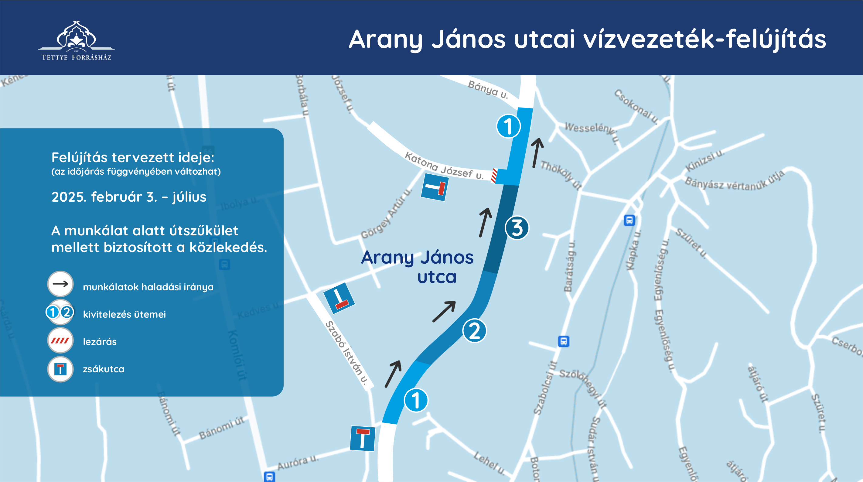 - A várhatóan júliusig tartó korszerűsítés 3 ütemben valósul meg, az egyes ütemek végén az adott útszakaszt ideiglenesen állítják helyre, az utca a felújítás zárásakor kap végleges burkolatot.