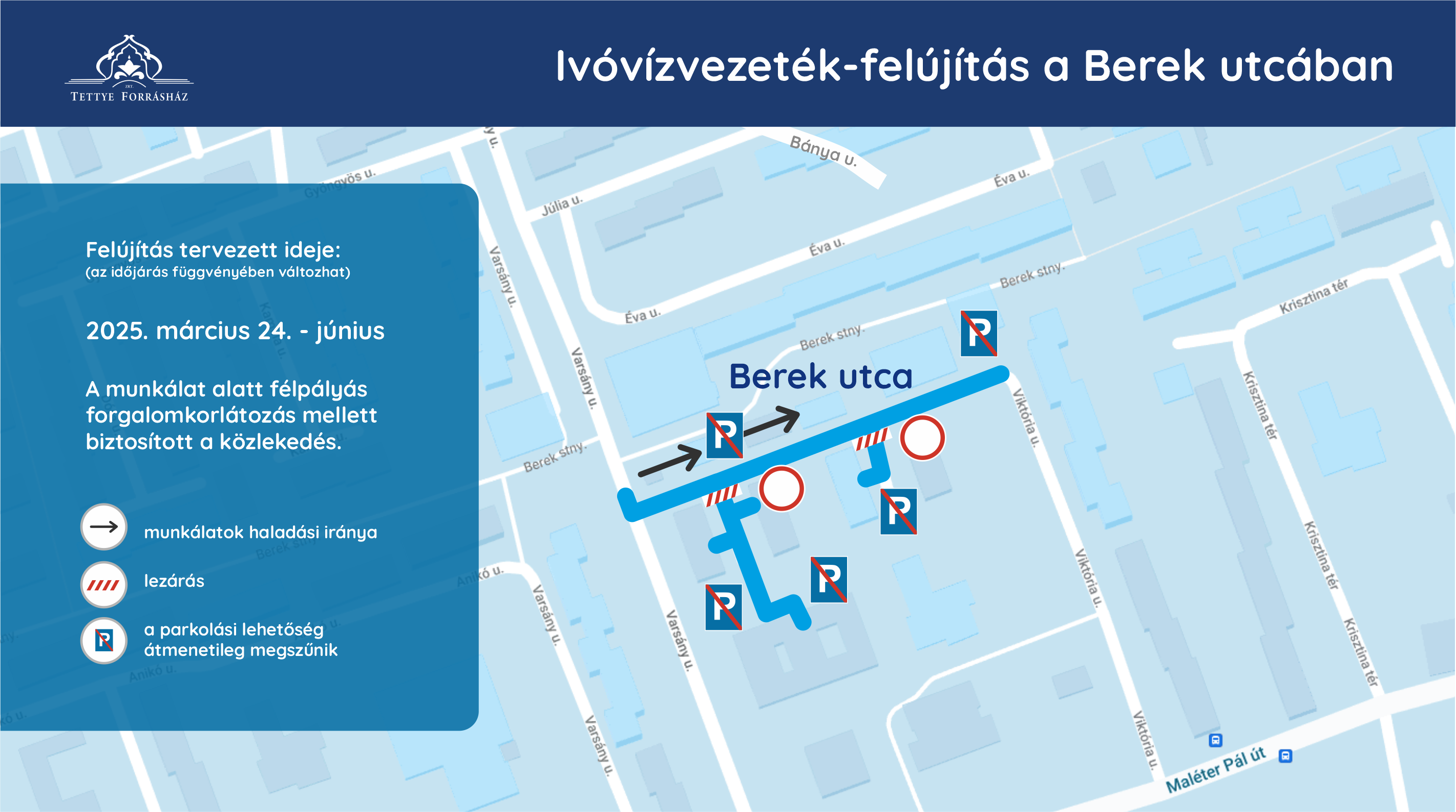 A munkálat alatt félpályás forgalomkorlátozás mellett az utcában biztosított lesz a közlekedés, a parkolási lehetőség azonban ideiglenesen megszűnik a Berek utca északi oldalán, valamint a társasházak közötti részen.