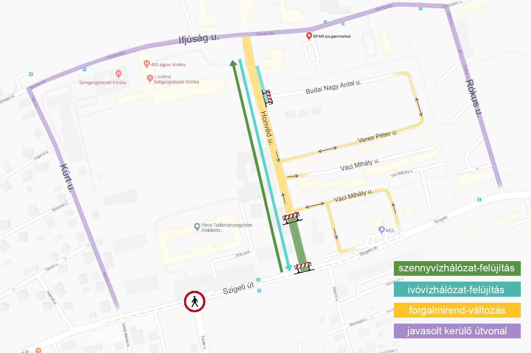 Mivel a szennyvízhálózat az út tengelyében húzódik, a Szigeti út irányából felfelé induló, aknaközönként haladó rekonstrukció szakaszosan ugyan (30-40 méter), de teljes szélességű útzár mellett valósulhat meg. Ezzel a Honvéd utca átjárhatósága megszűnik, azonban a környező utcákba és a PTE telephelyére való behajtás a forgalom és a mentők számára mindvégig biztosított lesz vagy az Ifjúság útja, vagy a Szigeti út irányából.