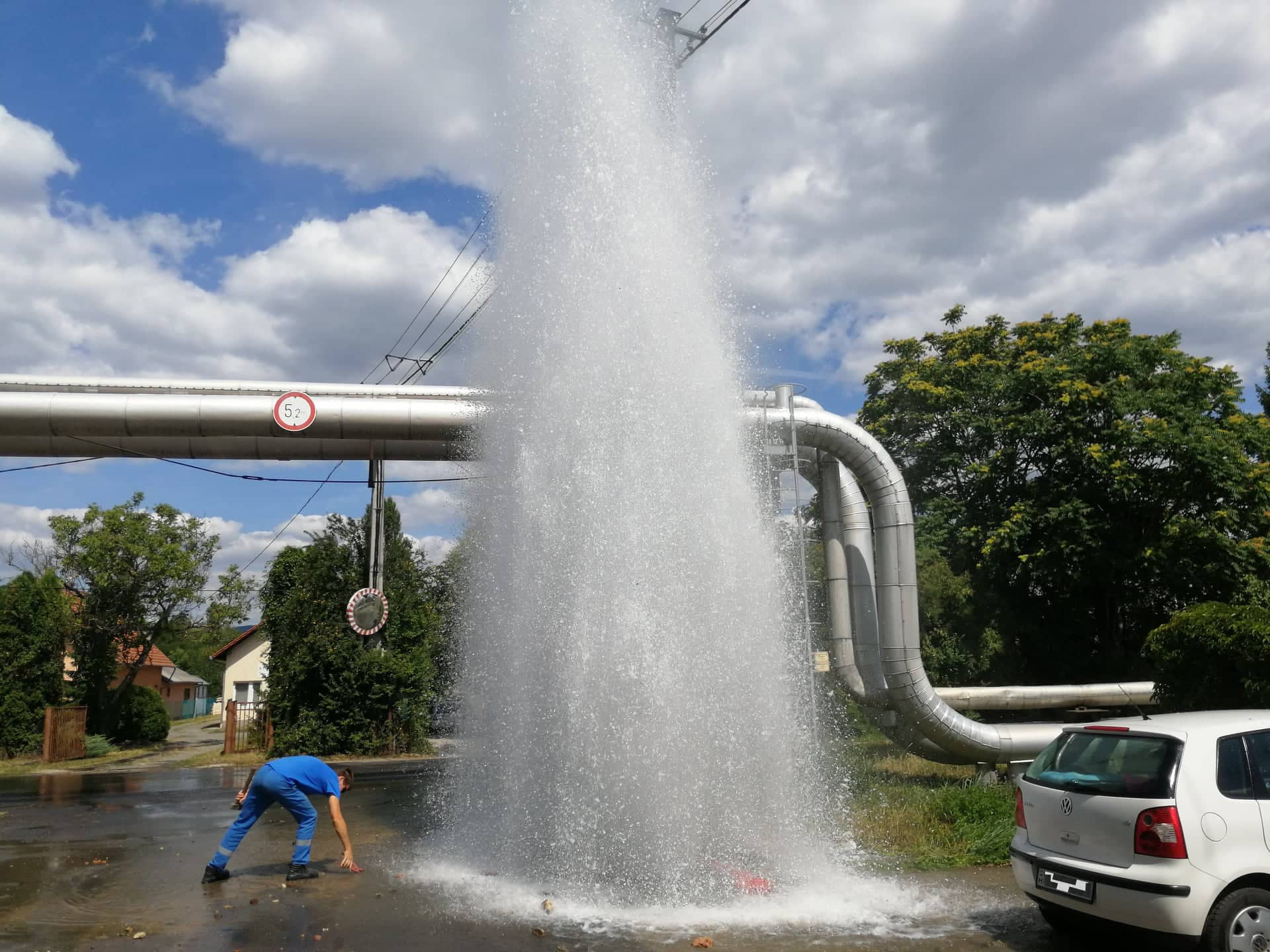 Mivel kisfeszültségű vezeték is volt a közelben, az áramszolgáltató is a helyszínre érkezett, kollégáink kellő elővigyázatossággal eljárva gyorsan megszüntették az alkalmi szökőkutat.