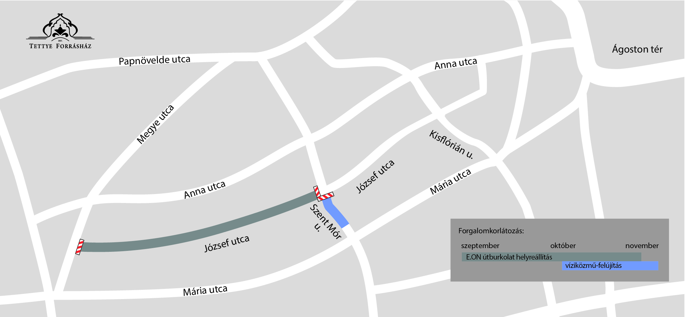 Eközben folytatódik az útburkolat helyreállítása a József utca Szent Mór utca - Megye utca közti szakaszán, így a tervek szerint decemberre teljesen véget ér a TETTYE FORRÁSHÁZ Zrt. és az E.ON Hungária Csoport összehangolt, tavasszal indított, valamennyi szolgáltatást érintő közműcseréje.