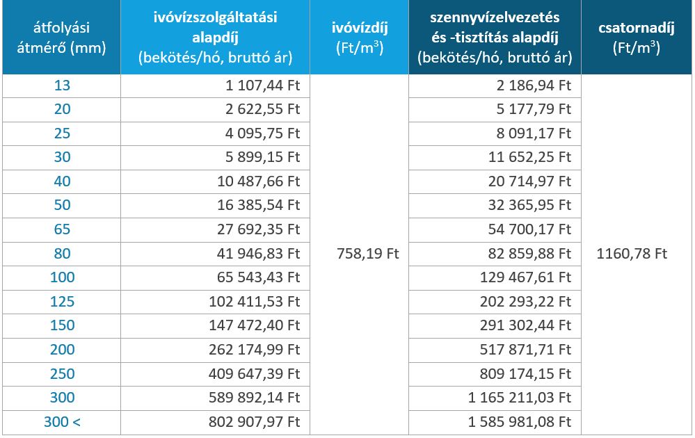 A közületi víziközmű-szolgáltatási díjak átlagosan 3,7%-kal emelkednek. A nem lakossági fogyasztók által fizetendő ivóvíz köbméterenkénti nettó egységára 597 forintra (bruttó 758,19 Ft), a szennyvízelvezetés szolgáltatás nettó egységára 914 forintra (bruttó 1160,78 Ft) módosul.