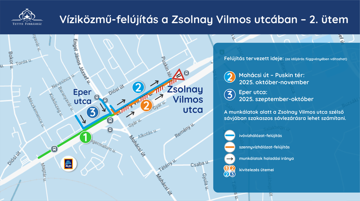A hálózatkorszerűsítés a kereszteződéstől keletre folytatódik tovább, a 2. ütemben egészen a Puskin térig halad a víz- és szennyvízvezetékek cseréje. Az építési forgalom miatt az elkövetkező hetekben 50-60 méteres szakaszos sávlezárásokra lehet számítani a 6-os út belváros irányába haladó szélső sávjában. Október első hetében az Engel János utcai kereszteződés keleti sávjában is dolgoznak a szakemberek.