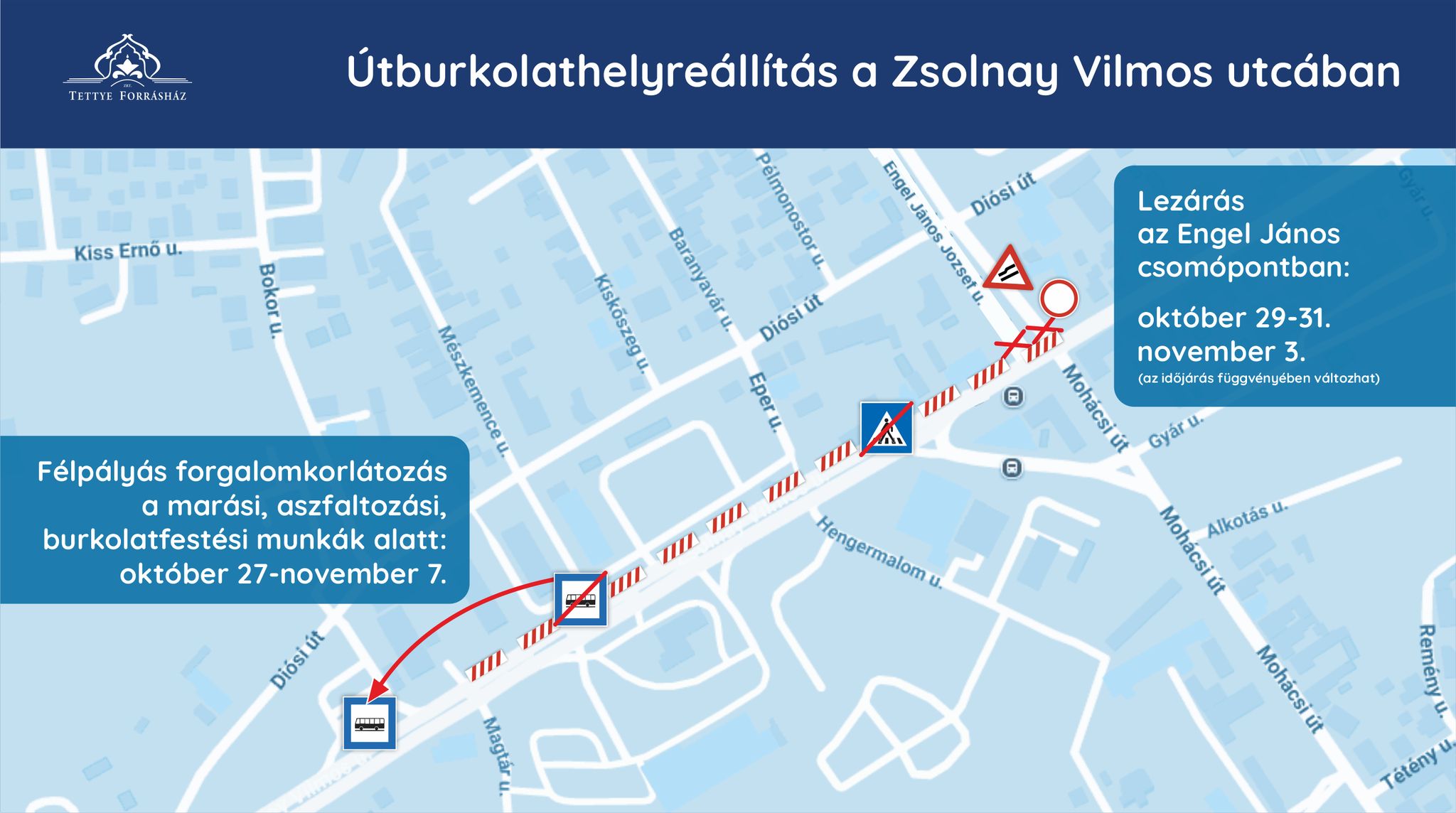 A munkálatok alatt, október 27-től várhatóan november 7-ig a Zsolnay Vilmos utca belváros felé haladó szélső sávját lezárják a Magtár utca és Engel János utca között. A közlekedés egy forgalmi sávon folyamatosan biztosított lesz.
