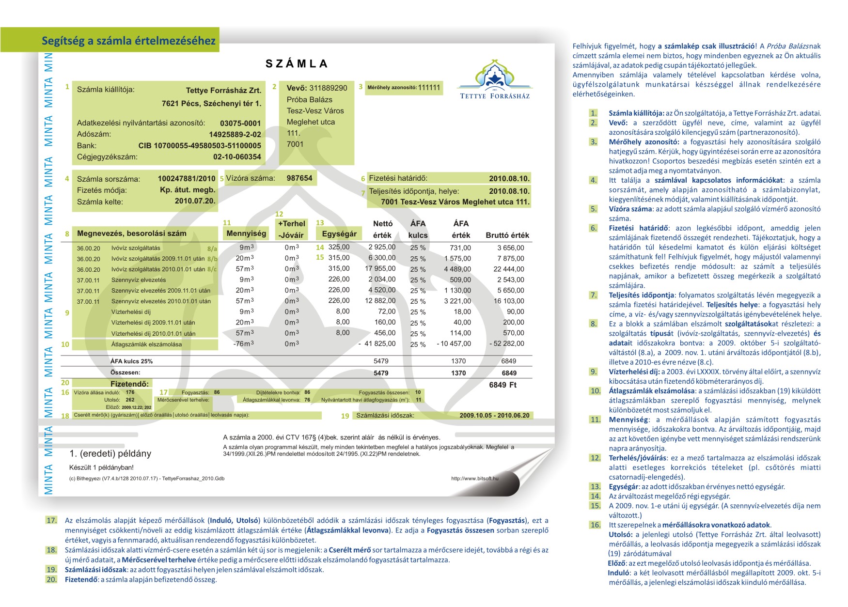 A borítékban ügyfeleink egy, a kézhez kapott számlára vonatkozó segédletet is találnak, melyet azzal a szándékkal készítettünk, hogy megkönnyítsük a számlán való eligazodást. A részletes számlamagyarázatban megmutatjuk, hol milyen adatokat talál, és az elszámolás szempontjából fontos tételeket is ismertetjük. Honlapunkon elhelyeztünk egy kalkulátort, amelybe saját fogyasztási (leolvasási) adatait beírva ellenőrizheti számláját.