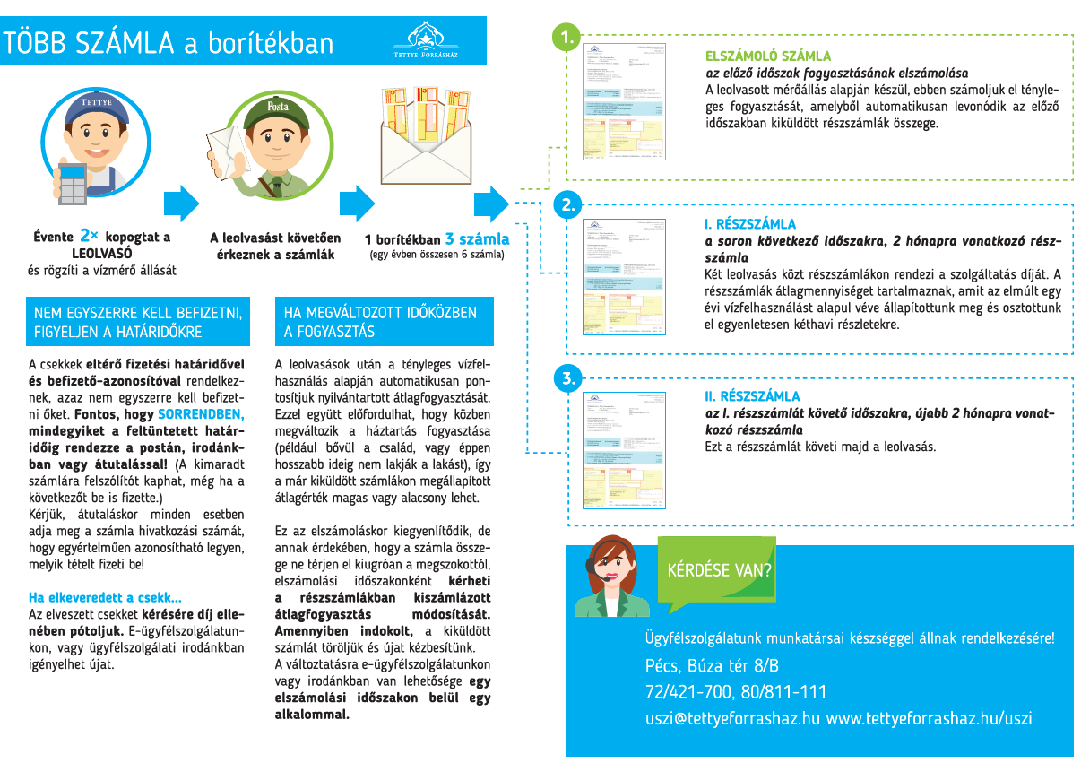 Társasáunk ezután is félévente olvassa le a vízmérőket, de ügyfeleink egyszerre, egy borítékban kapják meg az adott időszak vízdíjszámláit a jövőben. Az egyszerűsítést júniustól vezeti be cégünk, mindenki a soron következő leolvasás után számíthat először a vastagabb borítékra, amely a leolvasás alapján elkészített elszámolást és a következő hónapokra esedékes két részszámlát tartalmazza majd (a változásról szóló tájékoztatással).