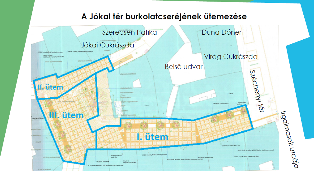 A burkolatcserét a BIOKOM NKft. koordinálja. A munka szakaszos lesz, így egy-egy térrészt csak a legrövidebb ideig zárnak le, az érintett üzletek biztonságos megközelíthetőségét biztosítják. A szeptember 26-án kezdődő I. ütem a tér déli részér érinti (Jókai tértől a Széchenyi térre vezető déli utca) és várhatóan egy hónapon át tart. A II. ütem a tervek szerint október végén, a III. szakasz november végén, december elején indul.