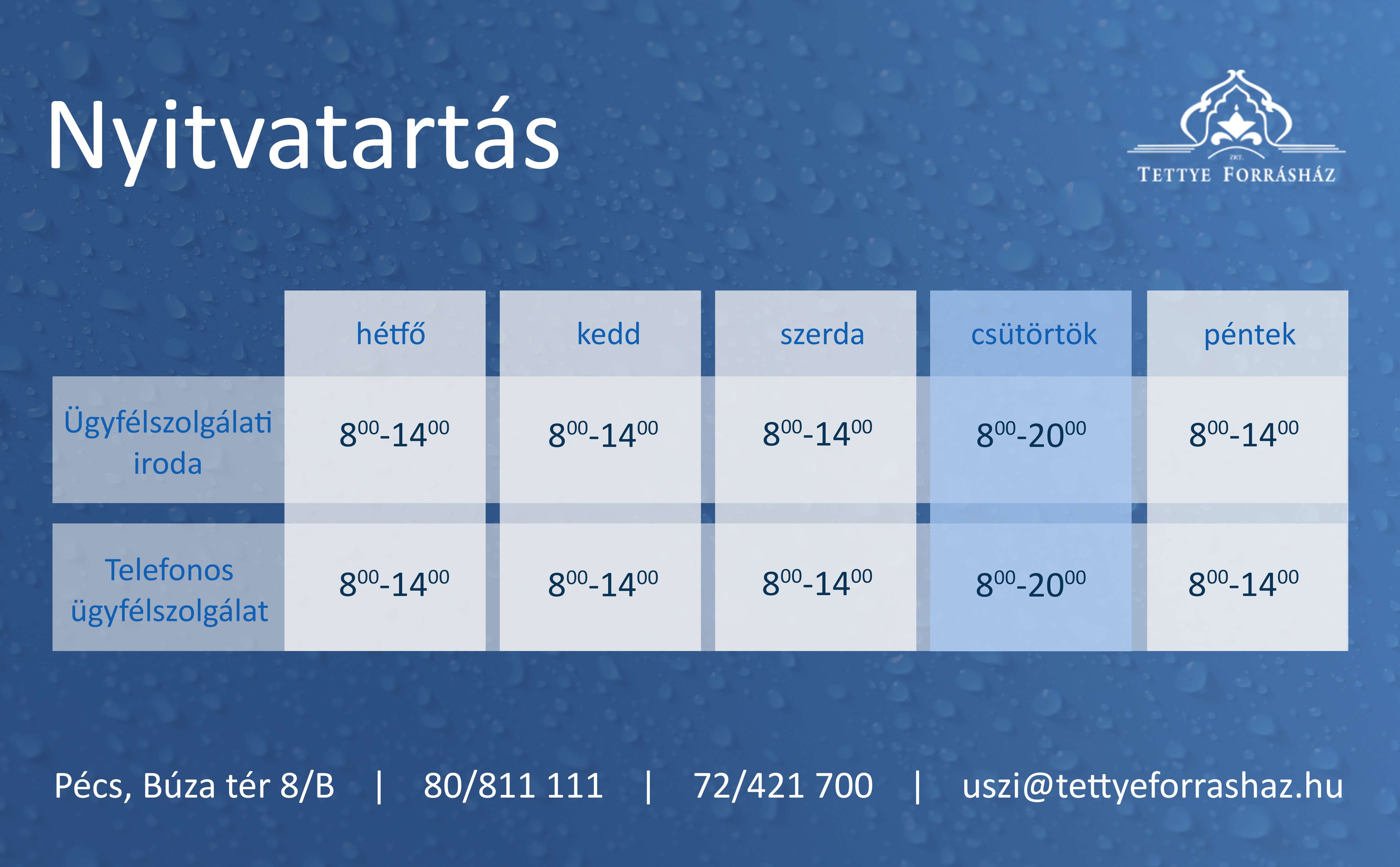 Február 1-jétől módosul társaság ügyfélfogadási rendje is, egységes lesz a személyes és telefonos megkeresések fogadása. A műszaki hibákat változatlanul 24 órában jelenthetjük be a TETTYE FORRÁSHÁZ diszpécserszolgálatán.