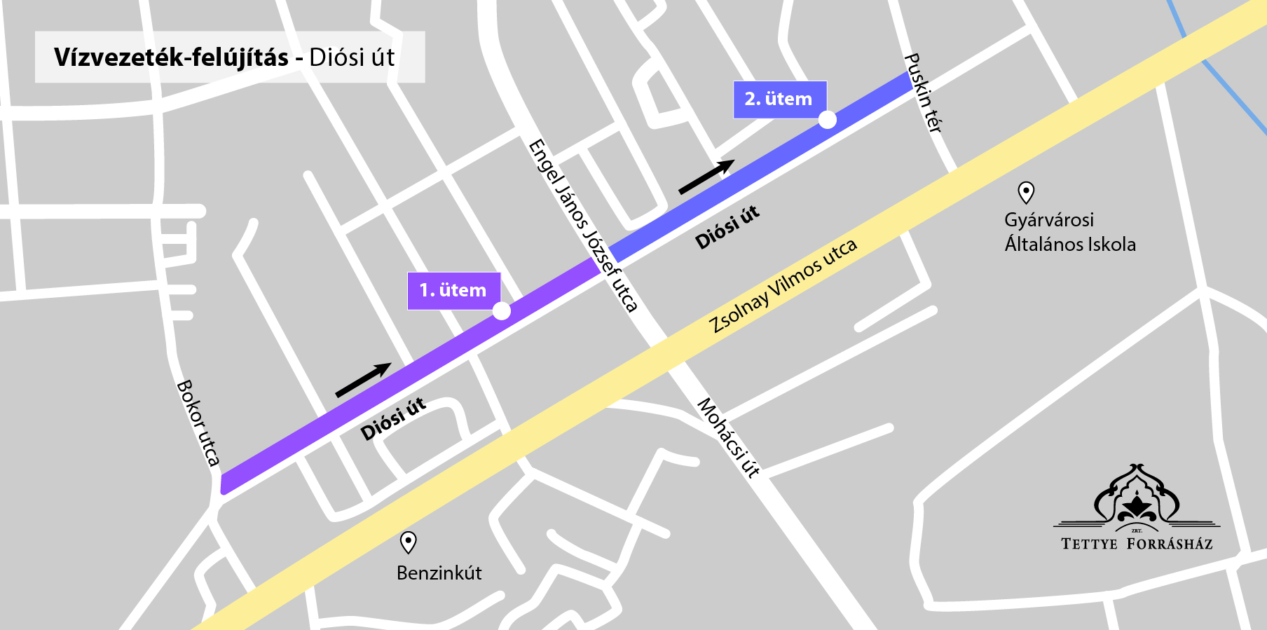 Ismét elindulnak a munkagépek a Diósi úton: június végéig (a korábbi 750 méter után) újabb 700 méteren kerül vadonatúj KPE vízvezeték az útburkolat alá a Bokor utca - Puskin tér között. Emellett 3 tűzcsap létesül és 9 nagyobb csomópontot építenek át a szakemberek, ezzel még biztonságosabb lesz a szolgáltatás, és egy-egy esetleges meghibásodás alkalmával kisebb területet érintő vízhiány mellett javíthatóak a csőtörések.