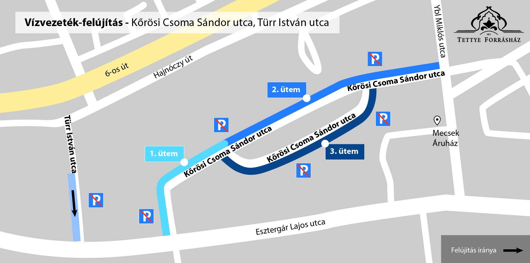 A Türr István utcában is folytatják hétfőtől szakembereink a régi acél és öntöttvas vízvezetékek tavaly megkezdett cseréjét. A munkálatok a Türr István utca nyugati oldalán 20-30 méteres szakaszokban haladnak az Esztergár Lajos utca irányába a zöldterület és az úttest érintésével. A forgalom biztosítása érdekében az utca keleti oldalán a munkálattal aktuálisan érintett szakasz mentén nem lehet parkolni; február utolsó hetében az utca zsákutca lesz. A felújítás várhatóan március elejéig tart.