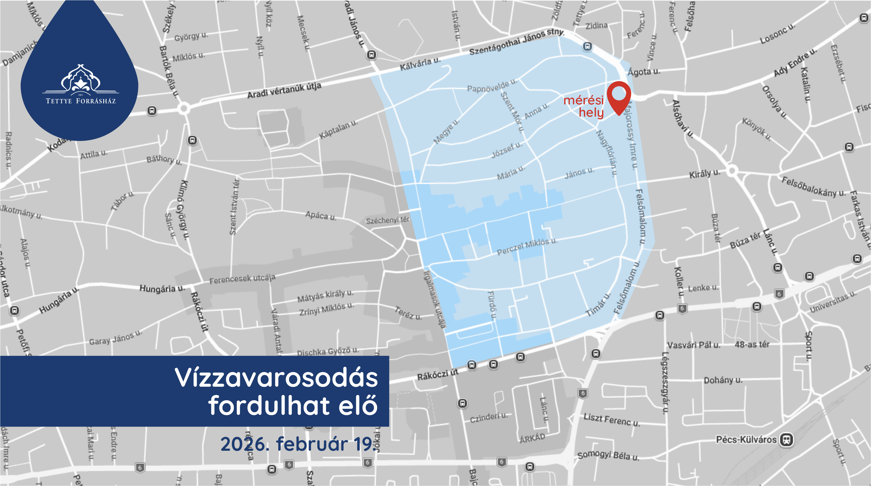 Szakembereink oltóvízhozamot mérnek csütörtökön 8:00-10:00 óra között a Majorossy Imre utcában. A nem üzemszerű, emelt vízsebességből és a környéki vezetékekben megváltozott áramlási irányokból adódóan vízzavarosodás fordulhat elő a Hunyadi János utca - Szentágothai János sétány - Majorossy Imre utca – Felsőmalom utca - Rákóczi út - Irgalmasok utcája - Széchenyi tér által határolt területen.