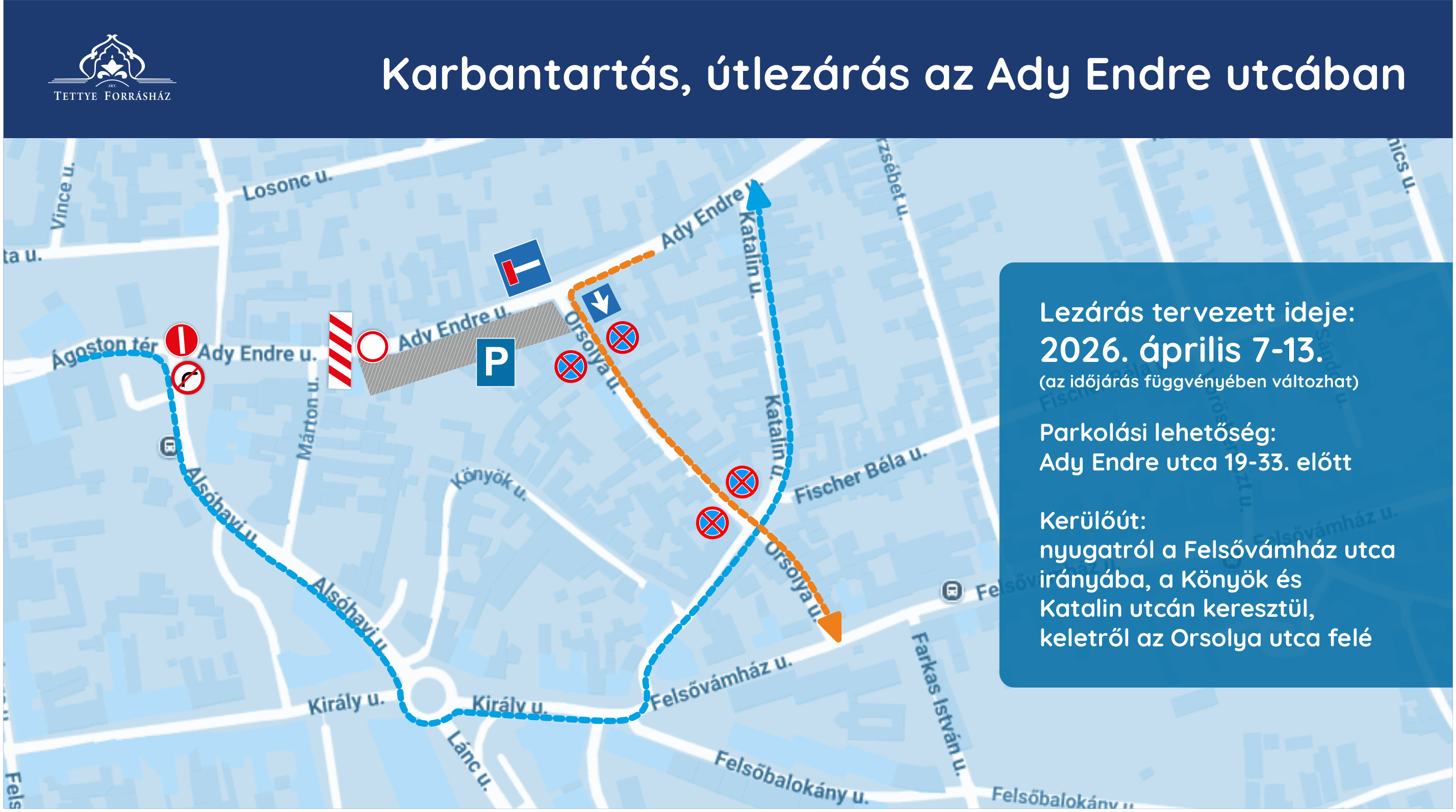 A kivitelezés teljes szélességű forgalomkorlátozást tesz szükségessé, ezért április 7-én 8:00 órától várhatóan április 13-ig lezárják az Ady Endre utca 15. előtti útszakaszt. Ennek következtében az utca mindkét irányból zsákutcává válik.