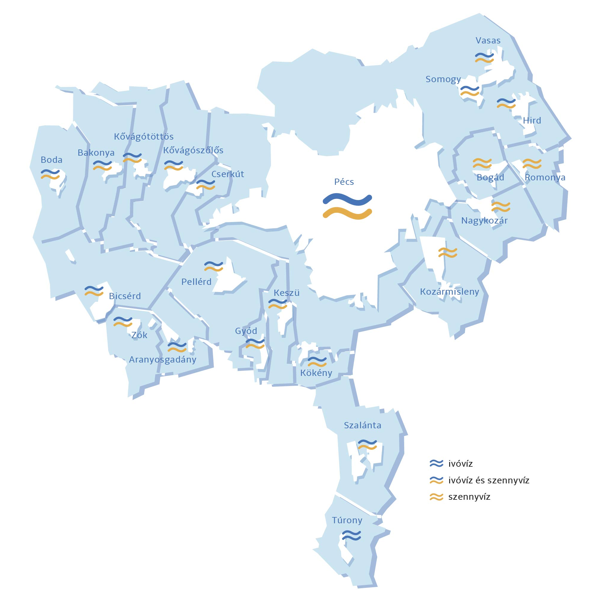 Fő feladatunkként Pécs és 14 környékbeli település lakóit látjuk el egészséges, biztonságos, a magyar és uniós előírásoknak egyaránt megfelelő ivóvízzel: kiváló minőségű, nagyobbrészt felszín alatti (tortyogói, pellérdi, tettyei) vízbázisból származó I. és II. osztályú réteg- és I. osztályú karsztvizet juttatunk el az otthonokba, intézményekbe, ezt egészítjük ki a társszolgáltatóktól átvett, parti szűrésű kutakból termelt ivóvízzel.