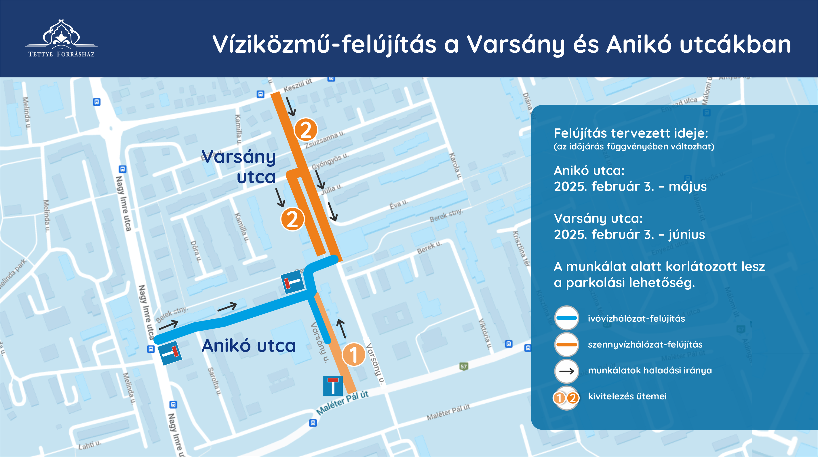 A városrésszel egyidős, elavult betonvezetékeket szakembereink több mint fél kilométer hosszan (519 méteren) cserélik új, korszerű csövekre, emellett 20 bekötés is megújul (170 méteren).