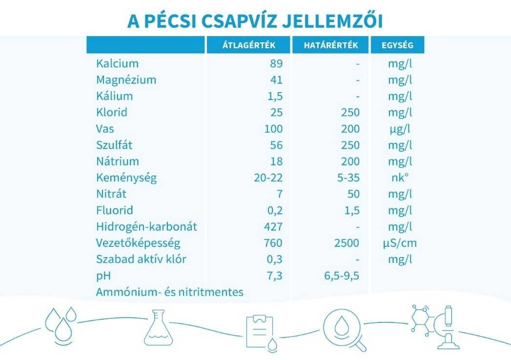 A pécsi csapvizet 130 éve házhoz kapják a város lakói, fogyasztása biztonságos (ezt folyamatos, kontrollált laborvizsgálatok garantálják), egészséges (minden benne van, ami a szervezetnek szükséges, de semmiből sincs benne több a kelleténél). A csapvíz csomagolásmentes, környezetbarát termék és olcsó (1 forintnál kevesebbe kerül literje).